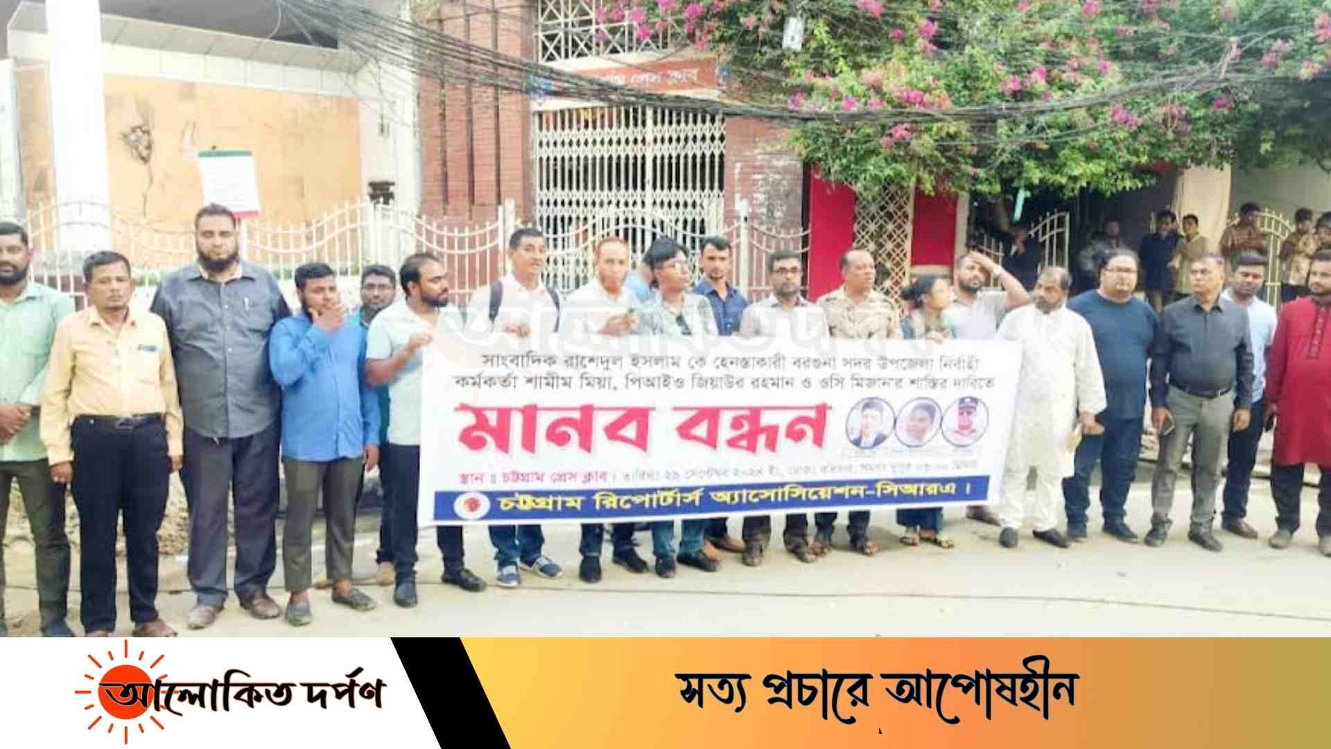 সাংবাদিক রাশেদুল ইসলাম কে সরকারি আমলা কর্তৃক হেনস্তার প্রতিবাদে মানববন্ধন