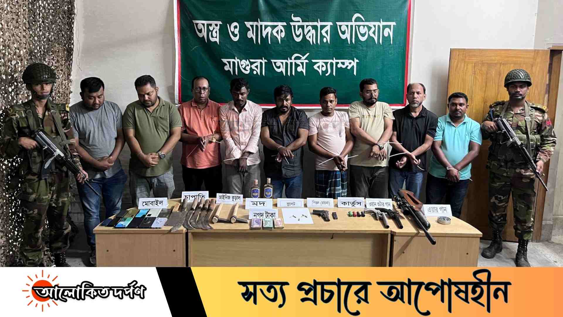 মাহিম সিদ্দিকী, মাগুরা প্রতিনিধিঃ মাগুরায় সেনাবাহিনীর অভিযানে মাগুরা জেলা চেম্বার অব কমার্সের সহসভাপতি ফরিদ হাসান খাঁন ও জেলা স্বেচ্ছাসেবক দলের যুগ্ম আহ্বায়কসহ ৯ জনকে আটক করা হয়েছে। তাঁদের কাছে থেকে কয়েকটি আগ্নেয়াস্ত্রের পাশাপাশি মাদক পাওয়া গেছে বলে জানিয়েছে সেনাবাহিনীর ।
