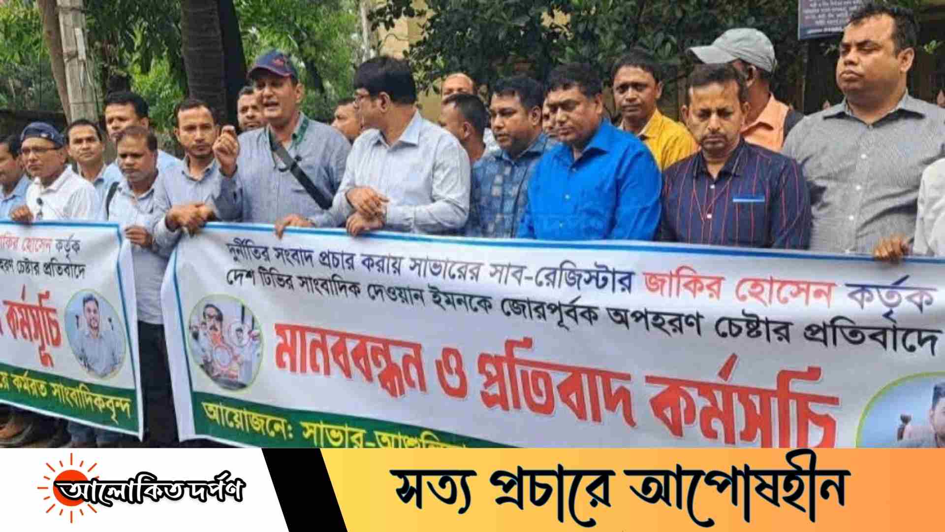 মানববন্ধনে সাভার, আশুলিয়া ও ধামরাই এলাকায় কর্মরত বিভিন্ন প্রিন্ট ও ইলেকট্রনিক মিডিয়ার সাংবাদিকসহ বিভিন্ন সাংবাদিক সংগঠনের নেতৃবৃন্দ উপস্থিত ছিলেন। বক্তারা অভিযোগ করেন, সাব-রেজিস্ট্রার জাকির হোসেনের বিরুদ্ধে দুর্নীতি, ঘুষ বাণিজ্য এবং সাংবাদিকদের ওপর অতর্কিত হামলার পাশাপাশি অপহরণের চেষ্টার মতো গুরুতর অভিযোগ রয়েছে।