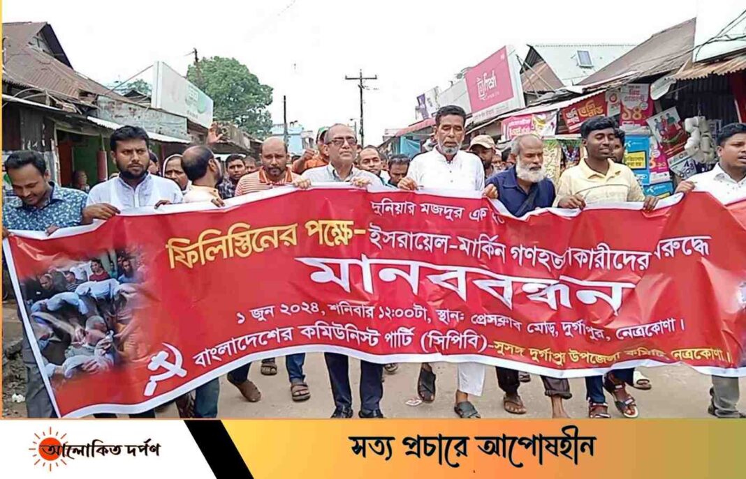 হৃদয় হাসান চৌধুরী, নেত্রকোনা জেলা প্রতিনিধি: ফিলিস্তিনে ইসরায়েলি আগ্রাসনের বিরুদ্ধে সারাদেশের ন্যায় দুর্গাপুরেও মানববন্ধন ও বিক্ষোভ মিছিল করেছে বাংলাদেশের কমিউনিস্ট পার্টি দুর্গাপুর উপজেলা কমিটি।