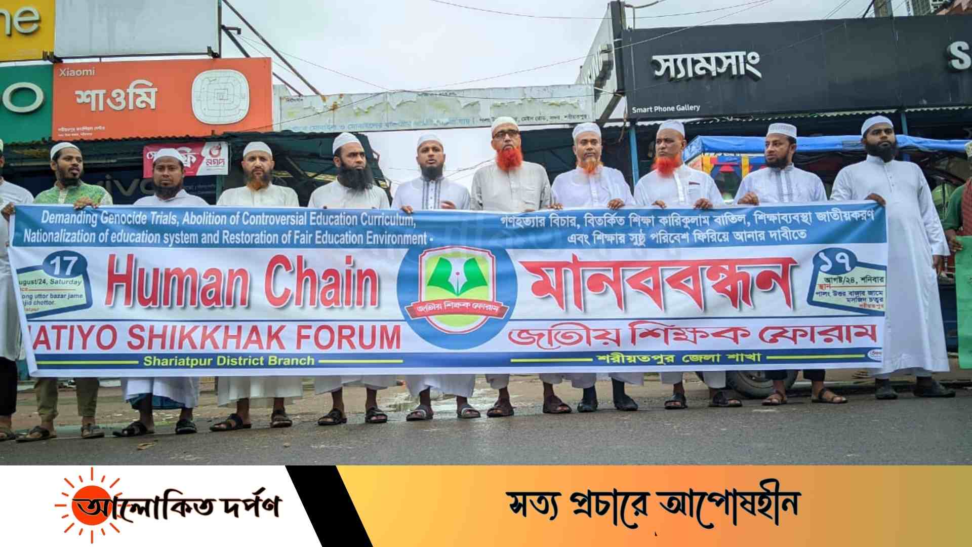 গতকাল শনিবার বিকাল ৫ টায় কেন্দ্রীয় কর্মসূচির অংশ হিসেবে জাতীয় শিক্ষক ফোরাম শরীয়তপুর জেলা শাখার উদ্যোগে গনহত্যার বিচার, বিতর্কিত শিক্ষা কারিকুলাম-২১ বাতিল, শিক্ষা ব্যবস্থা জাতীয়করণ ও শিক্ষার সুষ্ঠ পরিবেশ ফিরিয়ে আনার দাবীতে এই মানববন্ধন অনুষ্ঠিত হয়।