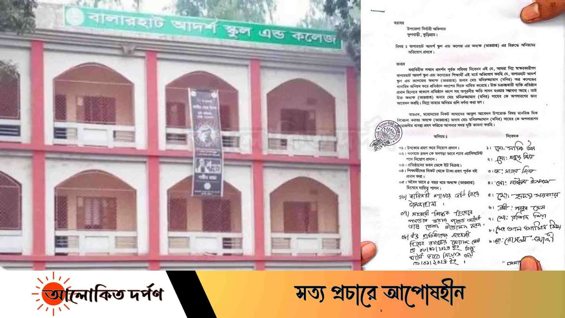 মোঃ বিপুল মিয়া, ফুলবাড়ী (কুড়িগ্রাম) প্রতিনিধিঃ কুড়িগ্রামের ফুলবাড়ী উপজেলার বালারহাট আদর্শ স্কুল এন্ড কলেজের ভারপ্রাপ্ত অধ্যক্ষ মনিরুজ্জামান সরকারের বিরুদ্ধে সীমাহীন দুর্নীতি ও অনিয়মের অভিযোগে অপসারণ দাবীতে লিখিত অভিযোগ দায়ের।