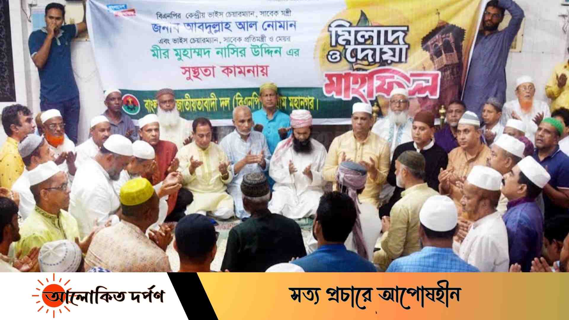 দোয়া মাহফিলে বিএনপি চেয়ারপার্সন বেগম খালেদা জিয়া, ভাইস চেয়ারম্যান আবদুল্লাহ আল নোমান ও মীর মোহাম্মদ নাছির উদ্দীনের দীর্ঘায়ু, শারীরিক সুস্থতা ও রোগমুক্তি কামনা করে বিশেষ মোনাজাত করা হয়। পাশাপাশি শহীদ প্রেসিডেন্ট জিয়াউর রহমান ও আরাফাত রহমান কোকোসহ মৃত্যুবরণকারী নেতাকর্মীদের রুহের মাগফেরাত কামনা এবং বিএনপির ভারপ্রাপ্ত চেয়ারম্যান তারেক রহমান ও অসুস্থ নেতাকর্মীদের রোগমুক্তি কামনা করে দোয়া করা হয়। দোয়া পরিচালনা করেন জামে মসজিদের খতিব মাওলানা এহসানুল হক।