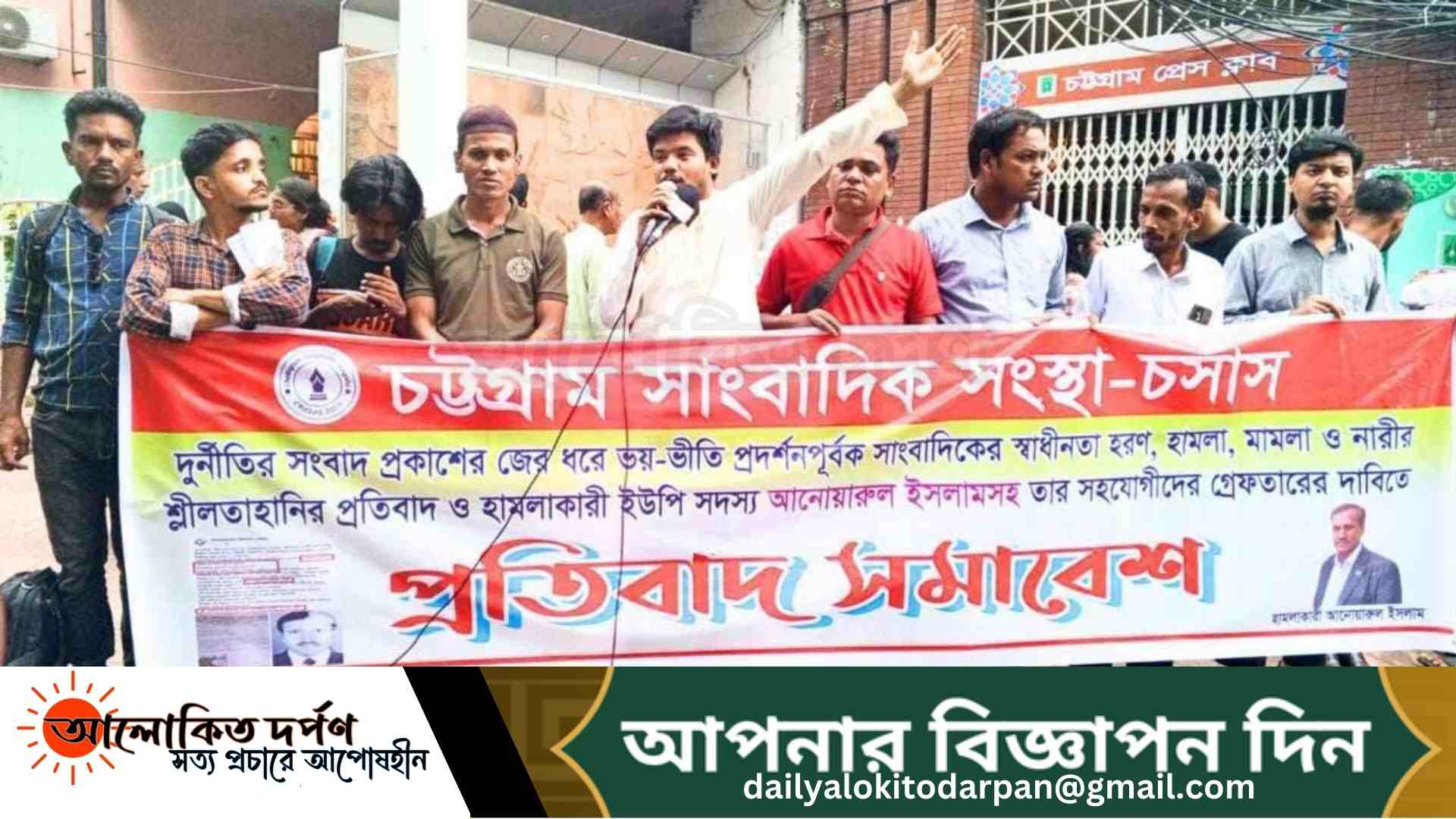 মোহাম্মদ ইসমাইল, চট্টগ্রাম প্রতিনিধিঃ দুর্নীতির সংবাদ প্রকাশের জের ধরে ভয়—ভীতি প্রদর্শনপূর্বক সাংবাদিকের স্বাধীনতা হরণ, হামলা, মামলা ও নারীর শ্লীলতাহানির ঘটনায় তীব্র নিন্দা ও প্রতিবাদ জানিয়ে হামলাকারী ইউপি সদস্য মোঃ আনোয়ারুল ইসলামসহ তার সহকর্মীদের গ্রেপ্তারের দাবিতে চট্টগ্রাম সাংবাদিক সংস্থা (চসাস) ও চট্টগ্রামে কর্মরত সাংবাদিকরা প্রতিবাদ সমাবেশ করেছে।