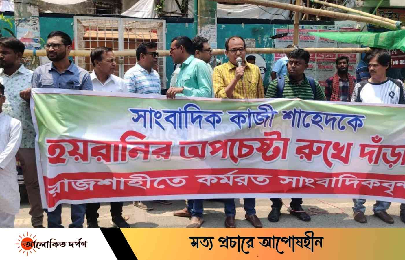 সংবাদ প্রকাশের জেরে রাজশাহীতে কর্মরত দেশ টিভির বিশেষ প্রতিনিধি ও রাজশাহী সাংবাদিক ইউনিয়নের (আরইউজে) সাবেক সভাপতি কাজী শাহেদের বিরুদ্ধে সাইবার আইনে রাজশাহী সিটি কর্পোরেশনের (রাসিক) ১৯ নম্বর ওয়ার্ড কাউন্সিলর তৌহিদুল হক সুমনের দায়েরকৃত মামলা প্রত্যাহারের দাবি জানিয়ে রাজশাহীতে কর্মরত সাংবাদিকবৃন্দ ও সম্মিলিত নাগরিক সমাজ এর মানববন্ধন।