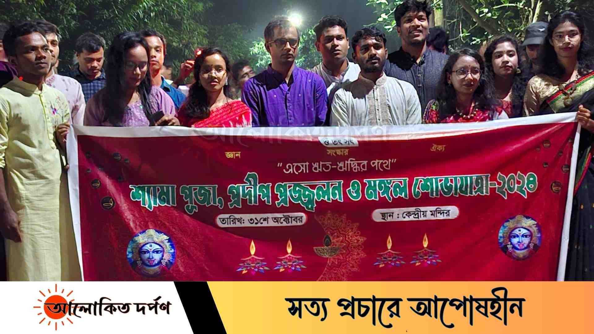 বৃহস্পতিবার (৩১ অক্টোবর ) সন্ধায় বিশ্ববিদ্যালয়ের কেন্দ্রীয় (অস্থায়ী) মন্দির থেকে একটি মঙ্গল শোভাযাত্রা বের করা হয়। সেটি বিশ্ববিদ্যালয় গুরুত্বপূর্ণ সড়ক প্রদক্ষিণ করে পুনরায় মন্দিরের সামনে এসে শেষ হয়।