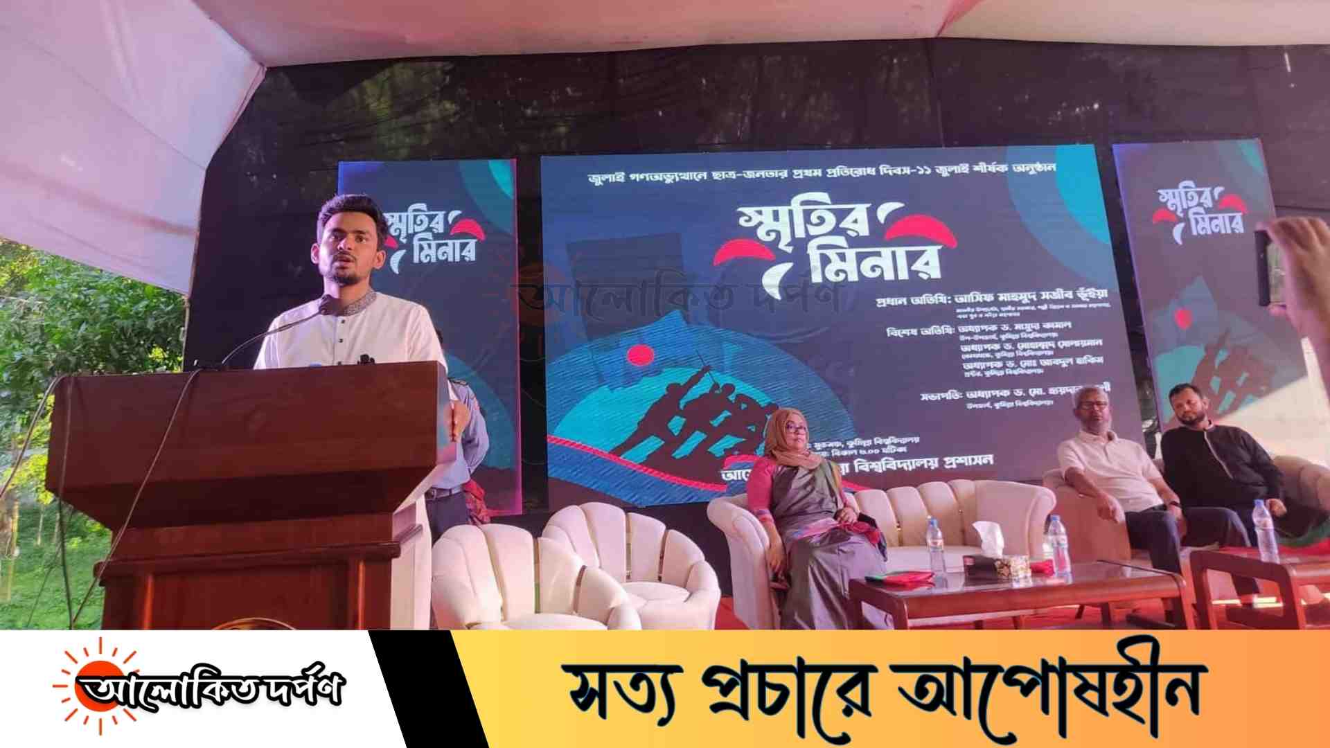 কুবি প্রতিনিধি: কুমিল্লা বিশ্ববিদ্যালয়ে (কুবি) 'জুলাই গণঅভ্যুত্থানে ছাত্র-জনতার প্রথম প্রতিরোধ দিবস—১১ জুলাই' শীর্ষক এক অনুষ্ঠানে স্থানীয় সরকার, পল্লি উন্নয়ন ও সমবায় মন্ত্রণালয় এবং যুব ও ক্রীড়া মন্ত্রণালয়ের উপদেষ্টা আসিফ মাহমুদ সজীব ভূঁইয়া ১১ জুলাইকে ‘প্রথম প্রতিরোধ দিবস’ হিসেবে ঘোষণা করেছেন।