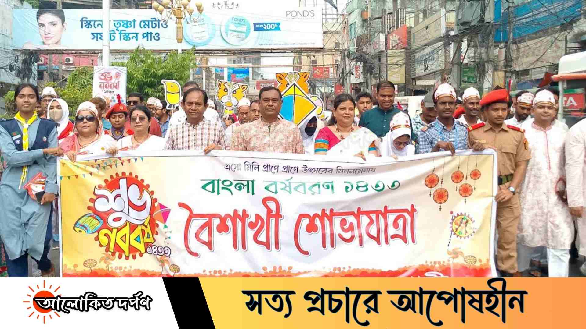 মোঃ মুজাহিদুল ইসলাম, রাজশাহী কলেজ প্রতিনিধিঃ বর্ণাঢ্য শোভাযাত্রার মধ্য দিয়ে রাজশাহী কলেজে বাংলা নববর্ষ ১৪৩৩ বরণ করা হয়েছে। মঙ্গলবার (১৪ এপ্রিল) সকাল ৯টায় রাজশাহী কলেজের কেন্দ্রীয় মাঠ থেকে শোভাযাত্রাটি যাত্রা শুরু করে আলুপট্টি মোড় প্রদক্ষিণ শেষে প্রশাসন ভবনের সামনে এসে শেষ হয়।