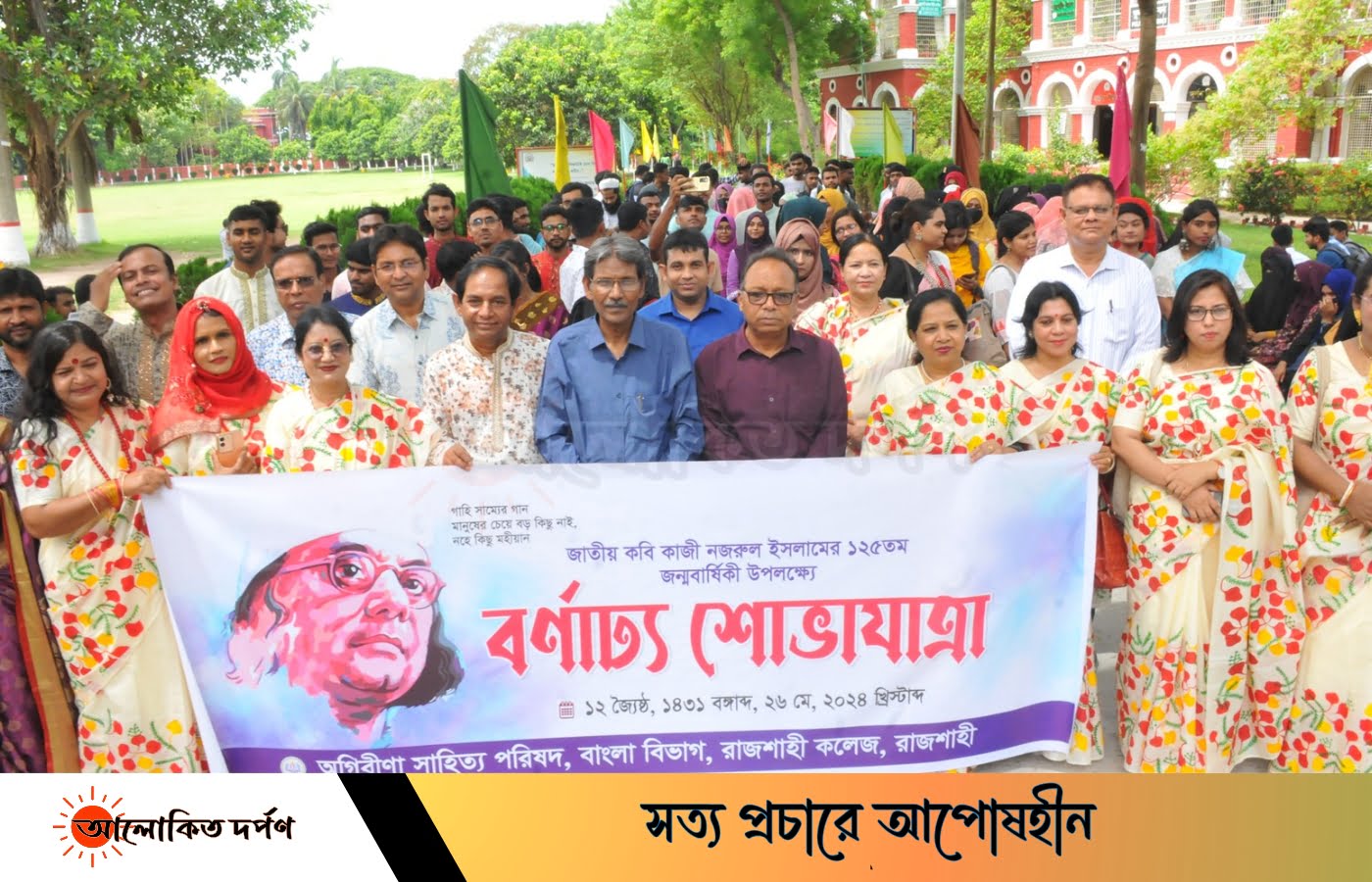 বোরবার (২৬ মে) রাজশাহী কলেজে সকাল ১০টায় বর্ণাঢ্য শোভাযাত্রার মাধ্যমে রবীন্দ্র-নজরুল জয়ন্তী-২০২৪ এর আনুষ্ঠানিকতা শুরু হয়। কলেজ অডিটোরিয়ামে সকাল সাড়ে ১০ টায় শুরু হয় রবীন্দ্র-নজরুল জয়ন্তী উপলক্ষ্যে আলোচনা সভা ও সাংস্কৃতিক অনুষ্ঠান।