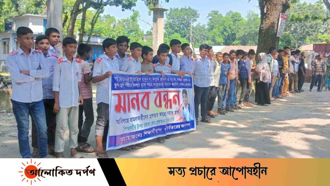 এস, এম হামিম সরকার নিরব, চিলমারী (কুড়িগ্রাম) প্রতিনিধিঃ কুড়িগ্রামের চিলমারীতে ৭ম শ্রেণি পড়ুয়া সাজ্জাদ হোসেনের (১৩) উপর অতর্কিত হামলার ঘটনায় অভিযুক্তদের দ্রুত গ্রেপ্তার করে আইনের আওতায় নিয়ে আসার প্রতিবাদে মানববন্ধন করেছে তার সহপাঠীরা। রোববার দুপুরে উপজেলা পরিষদ চত্ত্বরে ঘণ্টাব্যাপী এ মানববন্ধন অনুষ্ঠিত হয়।